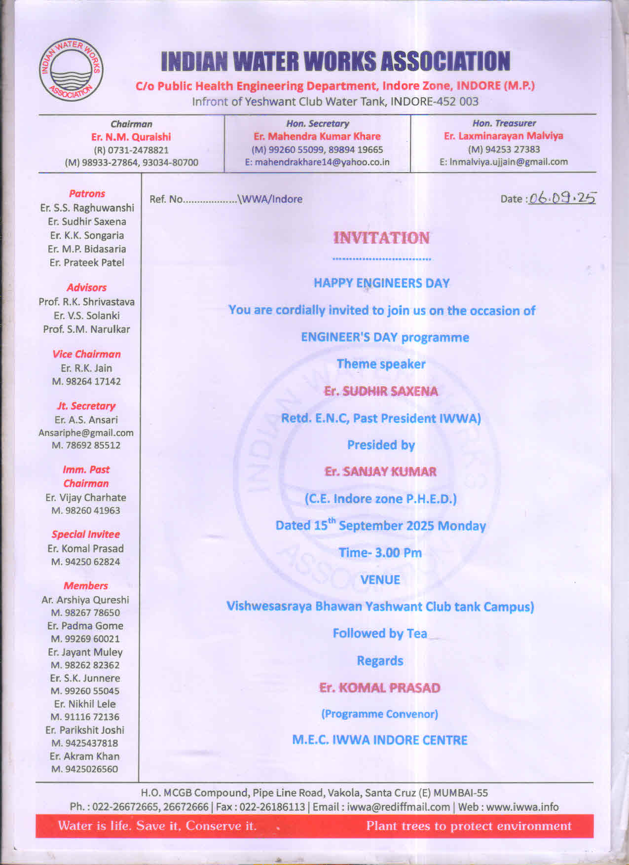 On 16th May, 2025, our Past President and Engineer-in-Chief, Er. K. K. Songaria Sahab, visited the IWWA Indore Centre office as well as the Chief Engineer's office in Indore. He discussed the IWWA membership drive and emphasized the need for dedicated work in each Engineer’s Department. He also mentioned that we are fortunate to have the opportunity to serve society. As it was his birthday today, the members present extended their wishes for his long and healthy life.