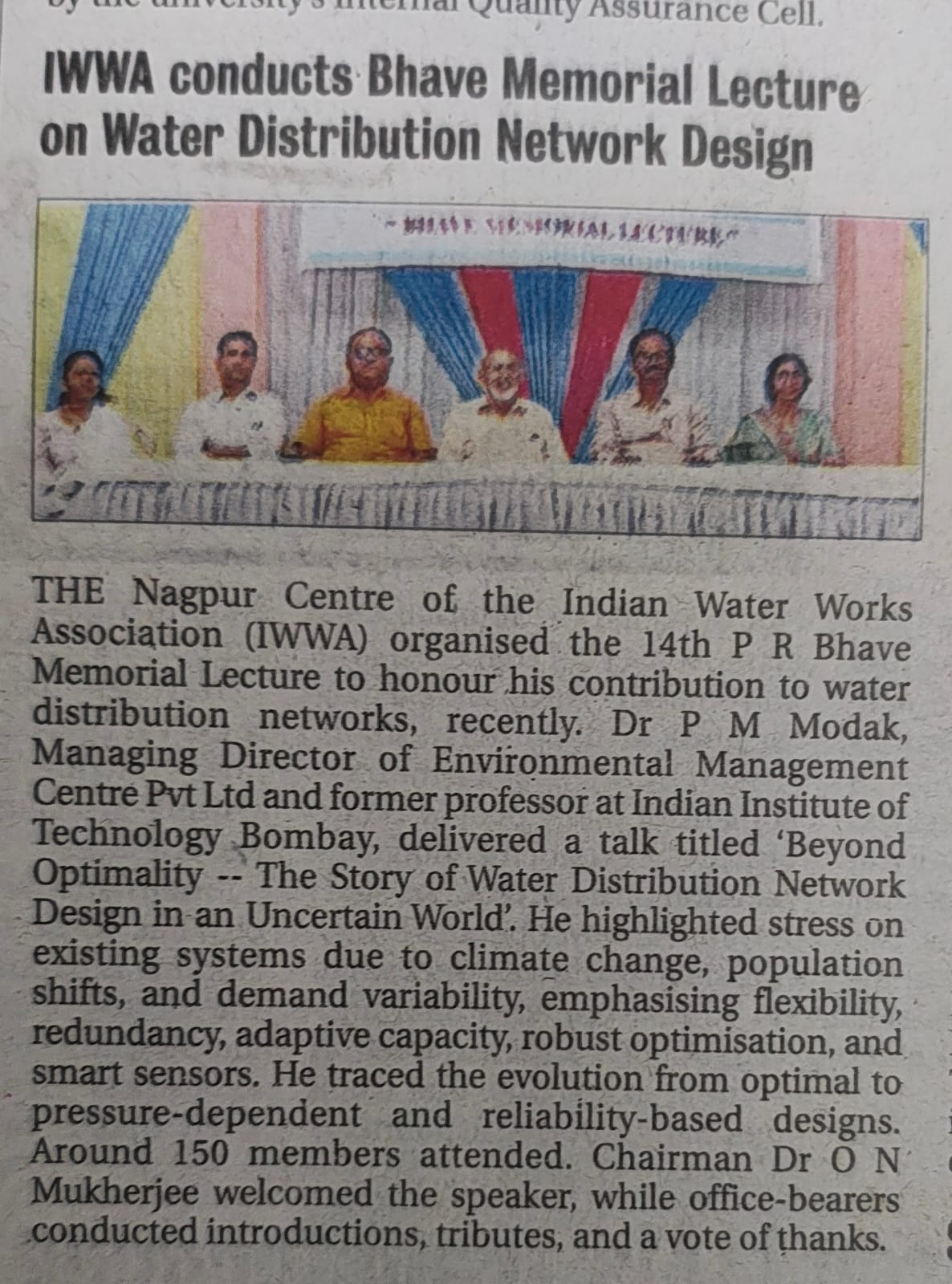 A Glimpse of Dr. A. G. Bhole Endowment Annual Lecture Program – 14th August, 2025 Organized by: IWWA Nagpur Centre This year’s lecture was delivered by Dr. S. Venkata Mohan, Director, CSIR-NEERI, on the topic "Surveillance and Management of Antibiotic Resistance in Wastewater." The lecture was attended by more than 150 members and student members.